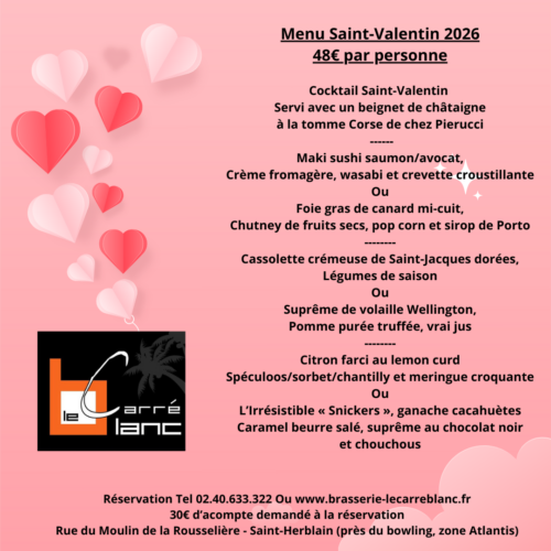 Réservez votre soirée spéciale Saint-Valentin au restaurant Carré Blanc à Saint Herblain. Découvrez le menu de la Saint-Valentin -…